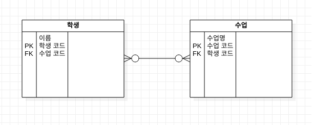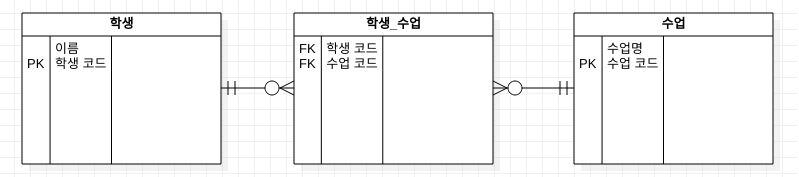 - '학생테이블'과 '학생_수업테이블'이 일대다 관계로 연관되어 있고, '학생_수업테이블'과 '수업테이블'이 다대일 관계로 연관되어 있다.