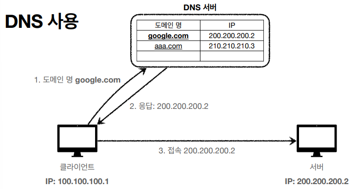 IP가 200.200.200.2 를 도메인 명 google.com으로 등록하면 클라이언트 측에서는 도메인 명을 DNS 서버측에 요청하게 되고 DNS 서버는 해당 도메인 명을 매핑하며 IP주소를 반환해주면 해당 IP주소를 통해 서버측에 요청을 한다.