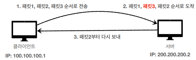 - 비신뢰성 : 중간에 패킷이 사라지거나, 패킷이 순서대로 서버측에 도착하지 않을수도 있다.
