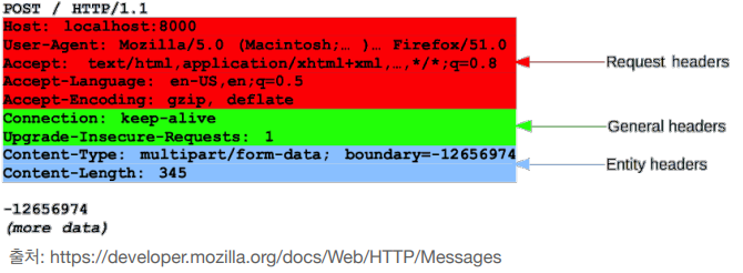 - ex) 메시지 바디 내용, 크기 , 압축, 인증, 요청 클라이언트, 서버 정보, 캐시 관리 정보 .....