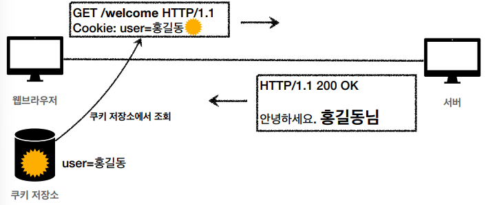 서버는 Set-Cookie: user=홍길동 이라는 응답을 통해 쿠키 저장소에 사용자 정보를 저장한다.